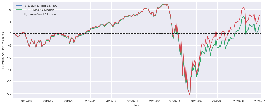 print(' Strategy YTD Performance =',round(float(DynAssAllytd[-1:]*100),1),'%')Using Matplotlib, this code snippet displays the year-to-date performance of three investment strategies based on the S&P 500 index: a Buy and Hold strategy based on the index, a maximum 1-year median performance strategy, and a Dynamic Asset Allocation strategy based on the index. In this plot, the dimensions are set to 15 inches wide by 6 inches tall, and for the sake of clarity, each strategy’s cumulative return is depicted as a percentage instead of a number. Time is represented on the X-axis, and the Cumulative Return in percentage is displayed on the Y-axis. It has been adjusted to create a better presentation of the margins, and a horizontal dashed line at 0% makes it easier to compare the strategies. It is possible to identify each line on the graph by looking at the legend. As a final step of the code, performance metrics for each strategy as of July 1, 2020, as well as their year-to-date performance, are also printed to the console. This provides an easy means of comparing their performance without requiring the visual interpretation of the plot.