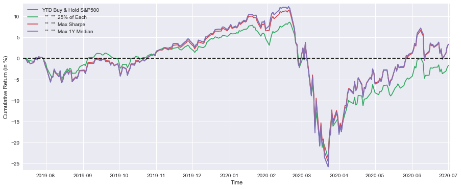 print(' "" "" Max 1Y Median "" "" =',round(float(YTD_max_median[-1:]*100),1),'%')This code allows you to generate a visual representation of cumulative returns for various investment strategies over a specified period of time compared to the S&P 500. It uses Matplotlib to create a line plot that illustrates Year-To-Date performance as a percentage for each strategy, based on the performance as it is represented by the different lines in the plot. Depending on the investment strategy, the size of the plot can be changed from 15 by 6 inches to a percentage format, which is based on the YTD values of each strategy. There is a name for each line that corresponds to the corresponding strategy on the graph. This chart shows the cumulative return in percentages on the x-axis, and the time on the y-axis is labeled Time. In order to enhance the appearance of the plot, the margins have been increased, and the dashed line at y equals zero indicates break-even performance. Moreover, the plot is displayed at the end of the command, and a legend is included. There is also a summary of the performance of each strategy below the plot, displaying the YTD returns formatted with one decimal place for quick reference, as well as the performance summary for each strategy.