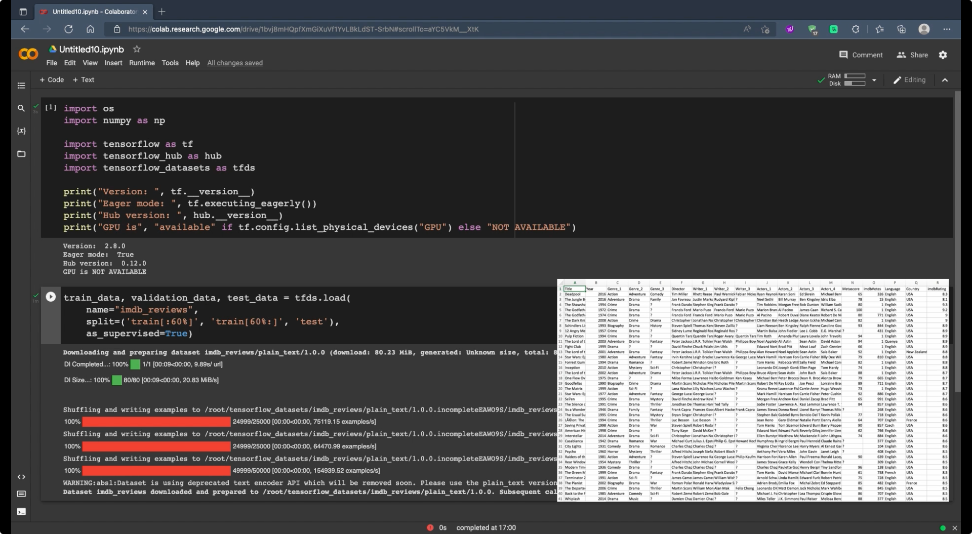 The IMDB dataset is available on imdb reviews or on TensorFlow datasets. The following code downloads the IMDB dataset to your machine (or the colab runtime):