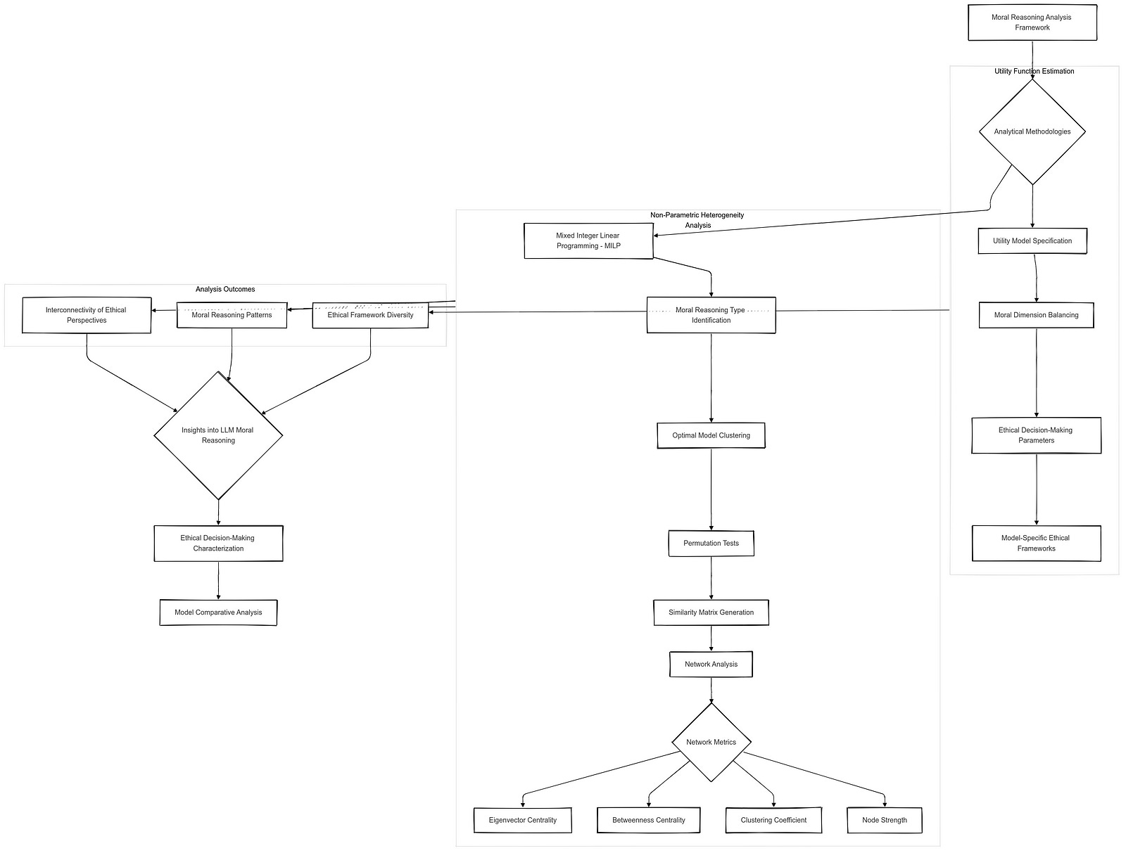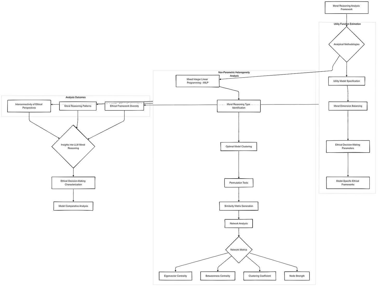 In addition to assessing rationality, the article explores the heterogeneity of moral reasoning across different LLMs using a non-parametric approach inspired by advanced econometric techniques. This analysis involves identifying distinct types of moral reasoning among models and quantifying the similarity between different models’ ethical frameworks. By constructing similarity matrices and employing network analysis, the study reveals patterns of clustering and diversity in moral reasoning, highlighting both shared ethical foundations and unique moral perspectives among LLMs.