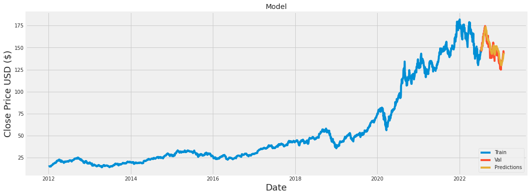 Close Predictions Date 2022-07-13 00:00:00-04:00 145.490005 146.457565 2022-07-14 00:00:00-04:00 148.470001 146.872879 2022-07-15 00:00:00-04:00 150.169998 147.586197 2022-07-18 00:00:00-04:00 147.070007 148.572937 2022-07-19 00:00:00-04:00 151.000000 148.995255 ... ... ... 2023-01-24 00:00:00-05:00 142.529999 138.565536 2023-01-25 00:00:00-05:00 141.860001 140.022110 2023-01-26 00:00:00-05:00 143.960007 141.225128 2023-01-27 00:00:00-05:00 145.929993 142.469315 2023-01-30 00:00:00-05:00 143.000000 143.833130