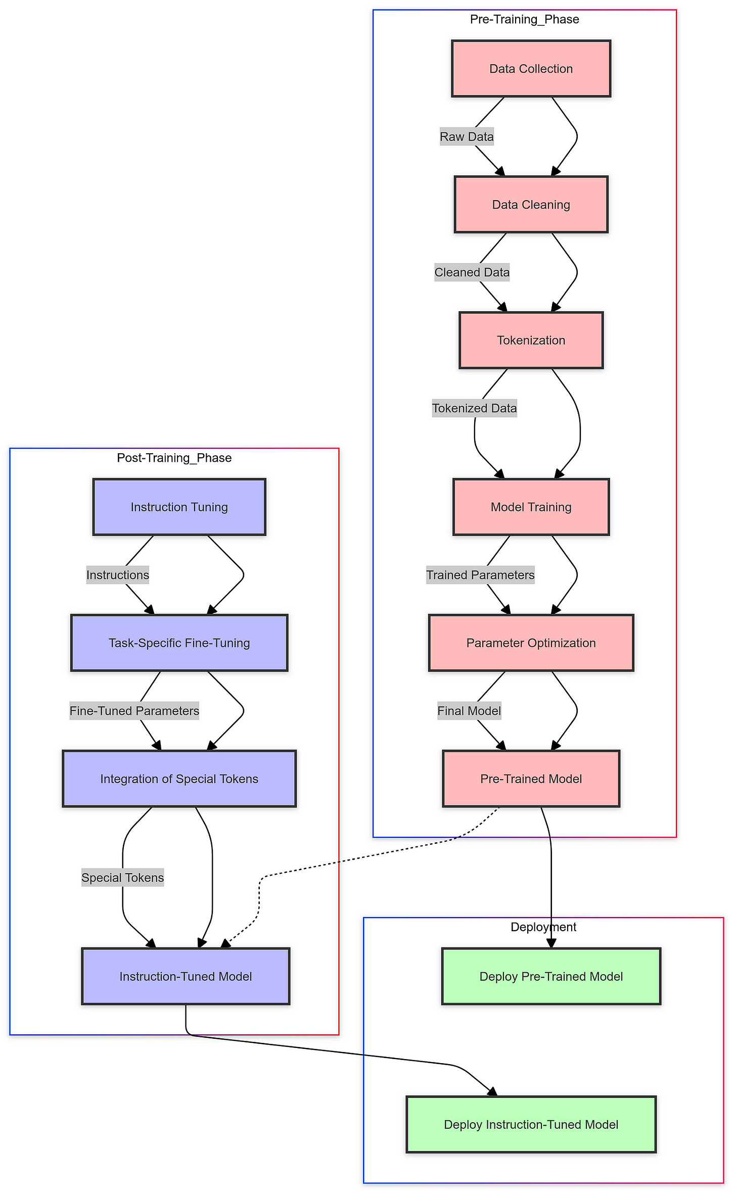 Post-training, or instruction tuning, involves fine-tuning the model to perform specific tasks and follow instructions. This phase teaches the model how to interact conversationally, adhere to desired formats, and execute particular functions.